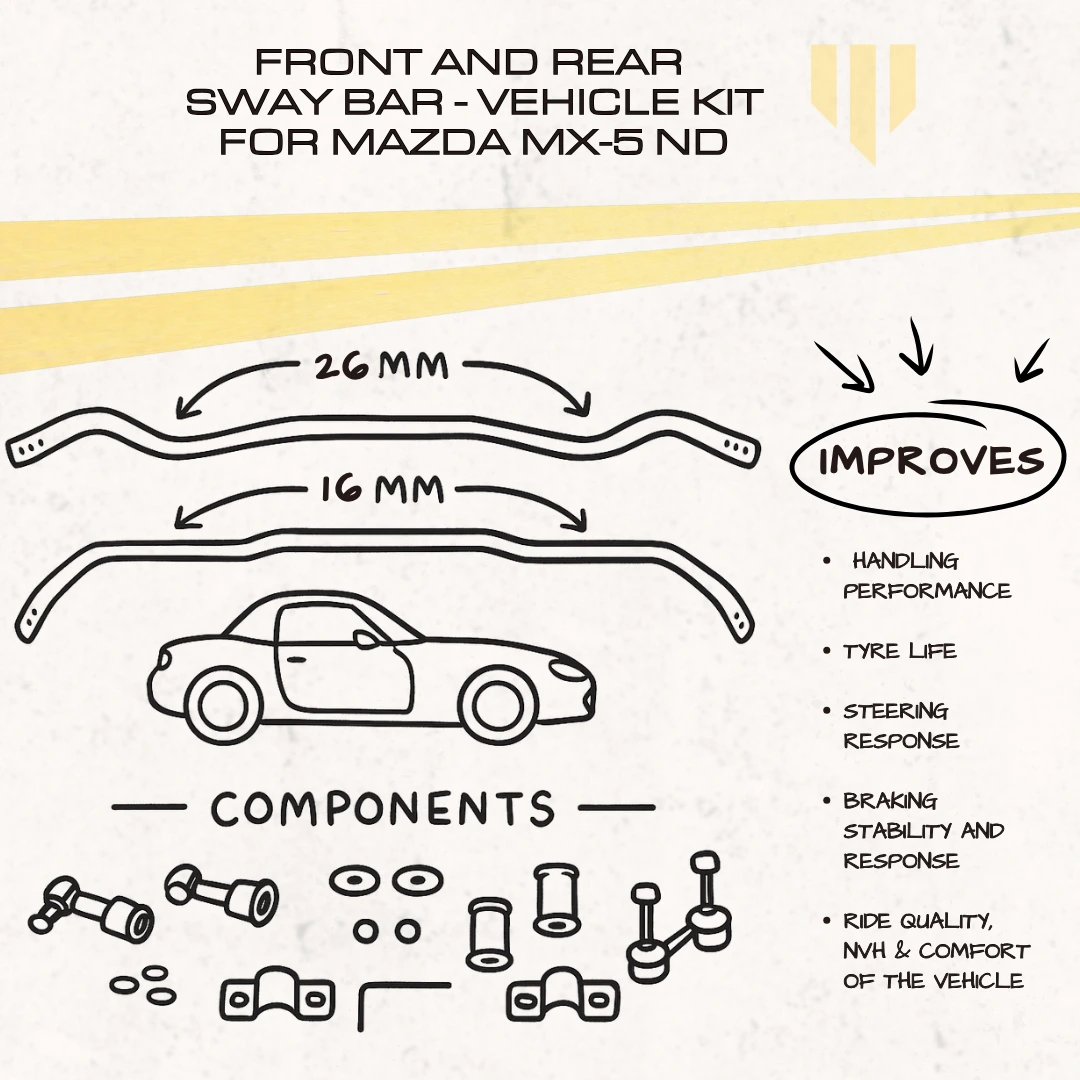 - Adjustable bar stiffness allows fine-tuning for road or track driving, giving the MX-5 a flatter, more predictable feel.