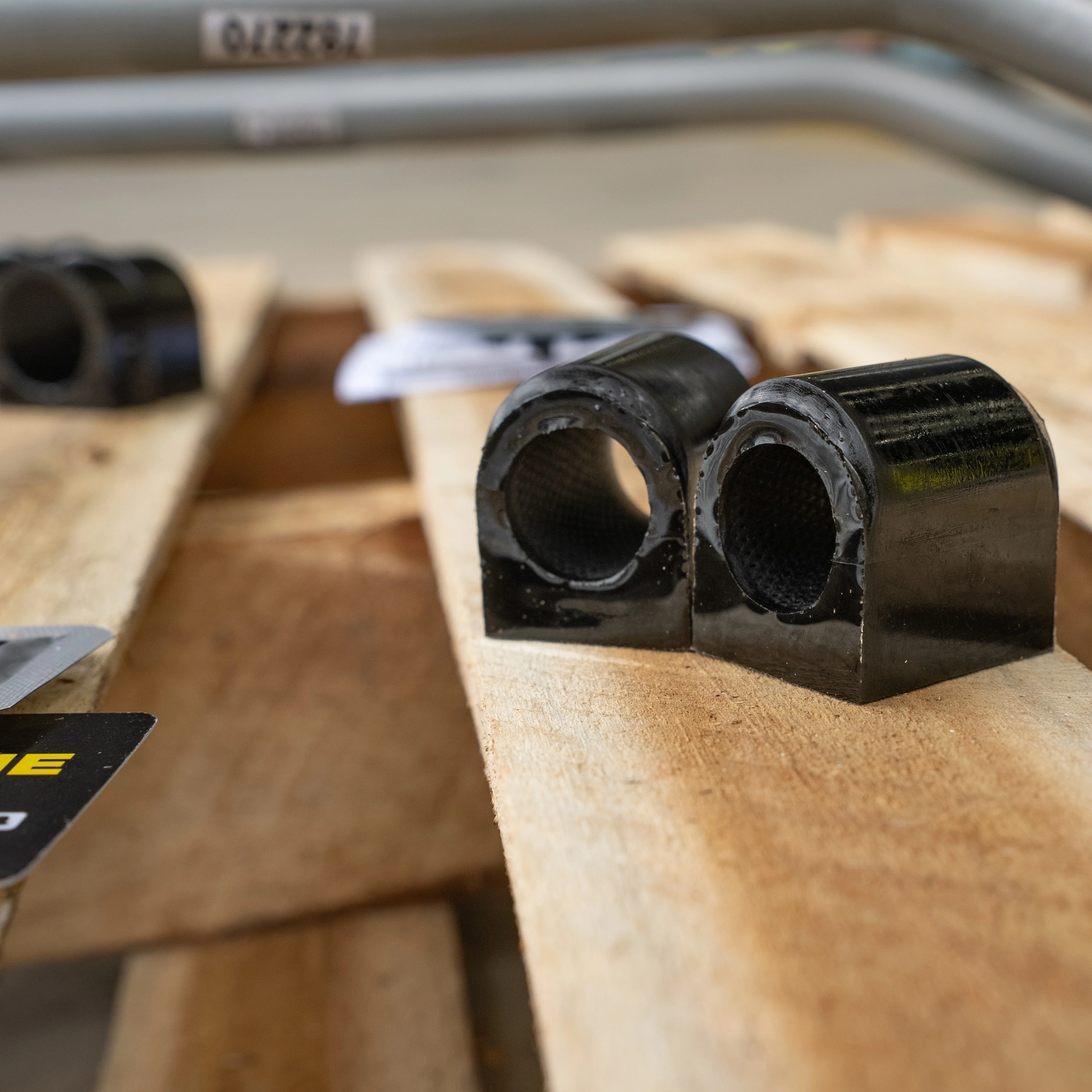 Suspension bushes control how much movement occurs between components under load. Factory rubber bushes deteriorate over time, allowing excessive deflection that reduces steering precision and alignment stability.
