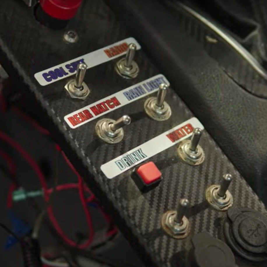 With weight-saving measures removing standard electronics, Caity now uses a dash-mounted switch for rear hatch access, a quick and efficient solution for gear loading or accessing her cooling system.